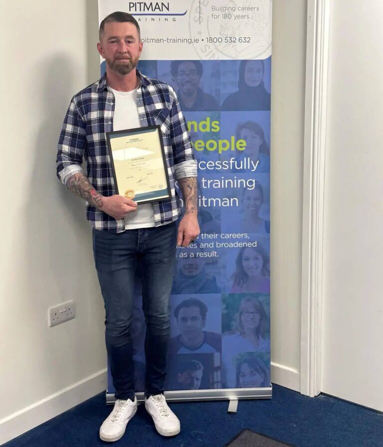 His experience at Pitman Training Carlow has been very positive, with supportive staff and a flexible learning structure that allows him to work full-time while studying.